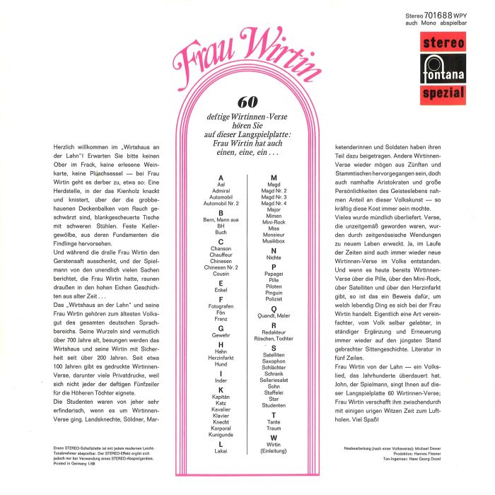 Hier ist noch keinerlei plattdeutscher Einfluss vorhanden. Viel mehr geht es darum, einige der im deutschen Volksgut verankerten "Wirtinnen"-Verse zu interpretieren. Jeder Vers beginnt im mit der Einleitung "Frau Wirtin hat auch..." und wird dann mit fünf meist mehr oder weniger "schlüpfrigen" Zeilen weiter gesponnen. Allerdings ist es von hier nur noch ein kleiner Schritt zu den "allgemeinen" Witzen, die sich dann auf der nächsten LP "(M)Lachen Sie sich frei" tummeln sollten