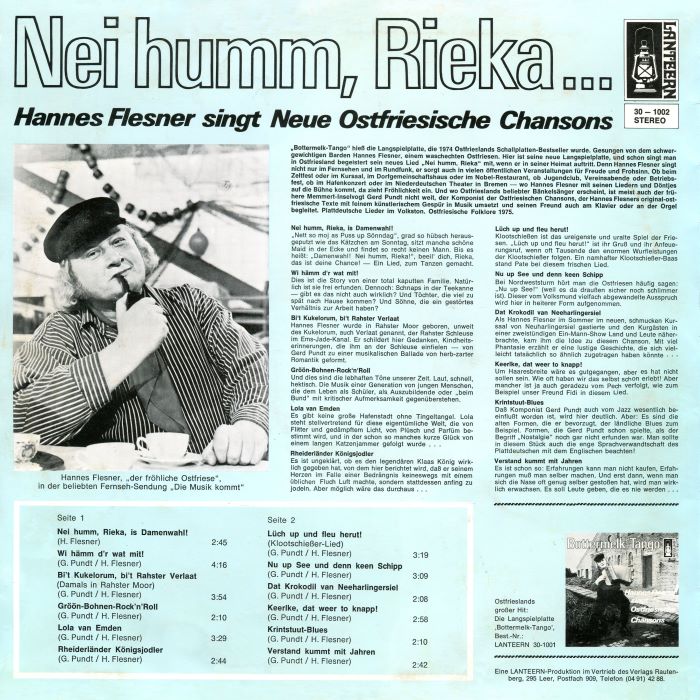 "Bottermelk-Tango" hieß die Langspielplatte, die 1974 Ostfrieslands Schallplatten-Bestseller wurde. Gesungen von dem schwergewichtigen Barden Hannes Flesner, einem wachechten Ostfriesen. Hier ist seine neue Langspielplatte, und schon singt man in Ostfriesland begeistert sein neues Lied "Nei humm, Rieka" mit, wenn er in der Heimat auftritt. Denn Hannes Flesner sing nicht nur im Fernsehen und im Rundfunk, er sorgt auch in vielen öffentlichen Veranstaltungen für Freude und Frohsinn. Ob beim Zeltfest oder im Kursaal, im Dorfgemeinschaftshaus oder im Nobel-Restaurant, ob Jugendclub, Vereinsabende oder Betriebsfest, ob im Hafenkonzert oder im Niederdeutschen Theater in Bremen - wo Hannes Flesner mit seinen Liedern und Döntjes auf die Bühne kommt, da zieht Fröhlichkeit ein. Und wo Ostfrieslands beliebter Bänkelsänger erscheint, ist meist auch der frühere Memmert-Inselvogt Gerd Pundt nicht weit, der Komponist der Ostfriesischen Chansons, der Hannes Flesners original-ostfriesische Texte mit feinem künstlerischen Gespür in Musik umsetzt und seinen Freund am Klavier oder an der Orgel begleitet. Plattdeutsche Lieder im Volkston. Ostfriesische Folklore 1975.